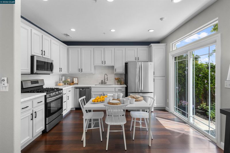 End unit in Canyon Park with nice separation from neighboring units. It is quieter and brighter than interior units. 121 Enchanted Way offers 4 beds, 2.5 baths, ~1,908 sq ft with high ceilings and strong natural light. Updated kitchen with Heath Ceramics backsplash, ample counters, and smart storage. Four bedrooms and laundry upstairs. New carpet and a current paint scheme. Private, low-maintenance flagstone patio with mature trees and vibrant color. Low HOA ($245) covers pool and front landscaping. Close to top SRVUSD schools, parks, City Center, and 580/680.