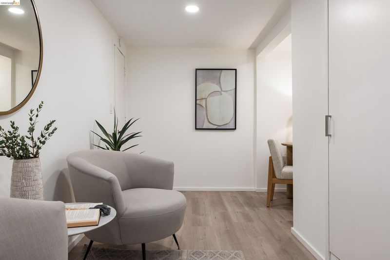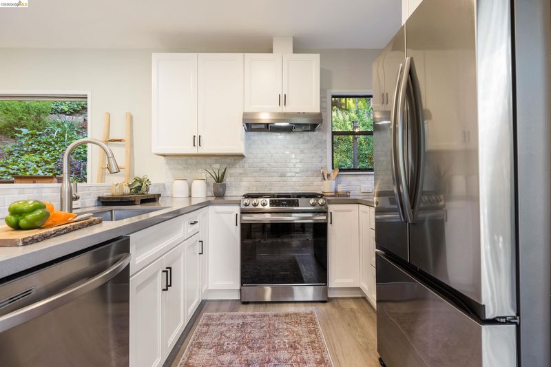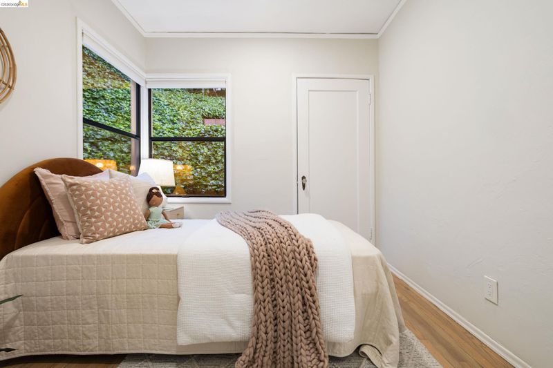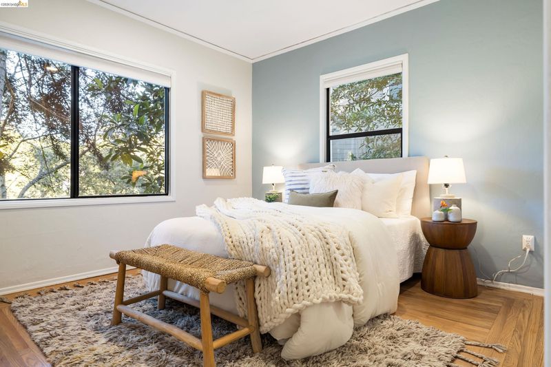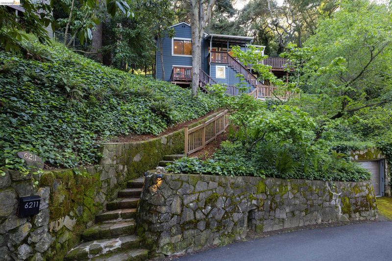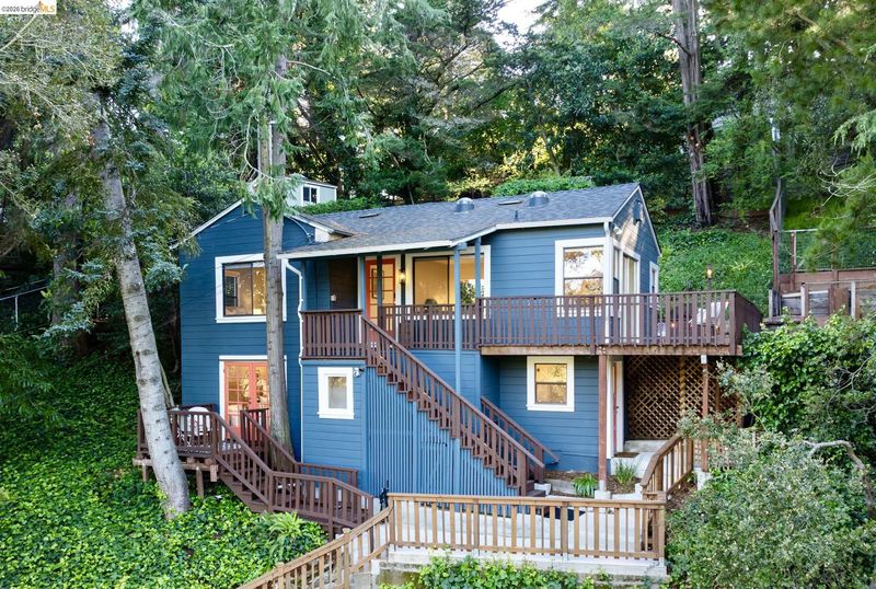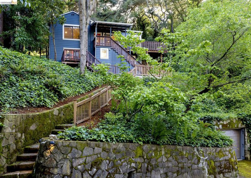Set on a generous, tree-filled lot, this 1937 home offers a peaceful retreat with seamless indoor-outdoor living. An open-concept layout connects the living, dining, and kitchen areas, featuring original hardwood floors, solar tubes, and two sets of sliding glass doors that lead to a wraparound deck with lush, verdant views. The updated kitchen pairs white shaker cabinetry, gray countertops, and a marble subway tile backsplash with a corner window overlooking the garden. The main level includes two light-filled bedrooms, one with a corner window framing an ivy-covered garden, and a refreshed hall bathroom. Downstairs, a private suite provides flexibility and separation, complete with French doors to a secluded deck and an updated ensuite bath with walk-in shower and modern finishes. A nearby bonus room offers additional office space, laundry area and home gym options. Outdoor spaces include an expansive rear deck, two hidden storage sheds, and a garage suitable for storage or a small car. A masonry retaining wall and lit staircase create a welcoming approach. Conveniently located near Montclair Village, parks, schools, and commuter routes.