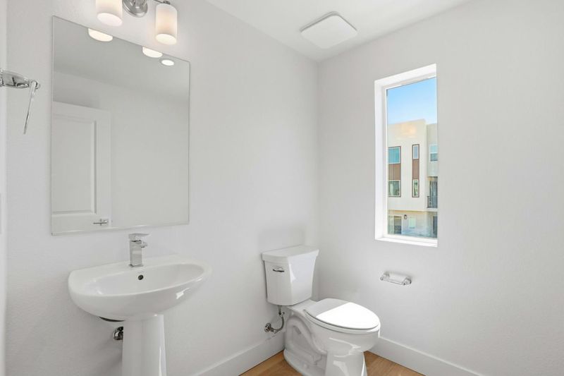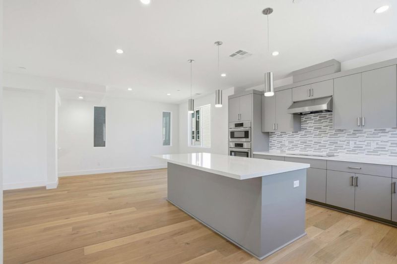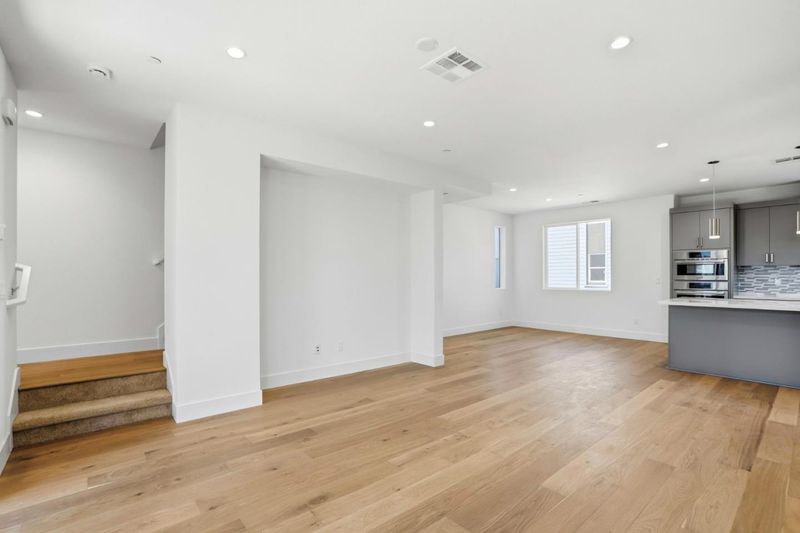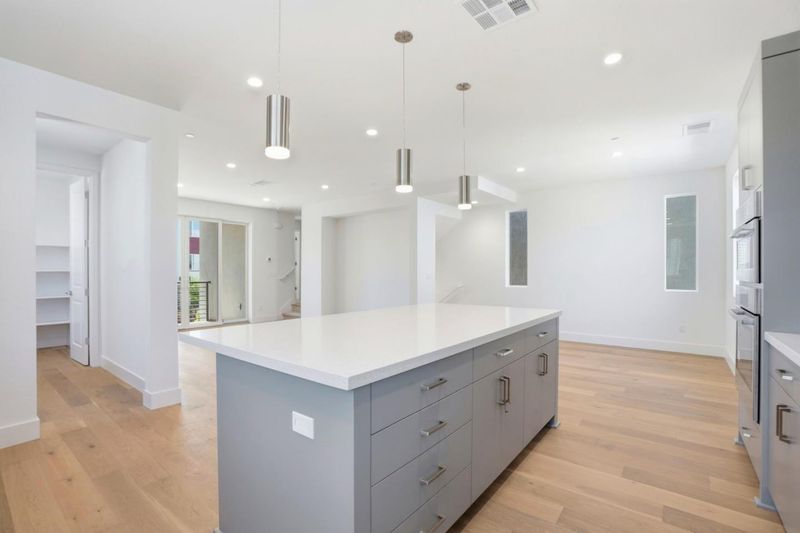 Rows Plan 1 offers 3 bedrooms and 2.5 bathrooms with a 2-car side-by-side garage and private landscaped courtyard entry. The open-concept layout features a spacious kitchen with large island, quartz countertops, upgraded pendant lighting, and Bosch 800 Series appliances, plus a dining area and first-floor den ideal for a home office. Enjoy an outdoor deck for relaxing or dining. The primary suite includes dual vanities and a spacious walk-in closet. Over $55K in designer upgrades. Hardwood floors throughout main living areas. Interior features include shaker cabinets with soft-close and 4 recessed LED lighting. Solar available for lease or purchase. Home ready for move-in. Condominium ownership. City Village offers 404 new homes in the heart of San Ramon. Amenities include a 2-acre park, walking and biking paths, BBQ area, and gathering spaces. Located near City Walk and less than one mile to City Center with shopping, dining, and entertainment. Close to Iron Horse Trail, Bridges Golf Club, transit, schools, and major employers. Photos may include renderings or options not representative of actual home.