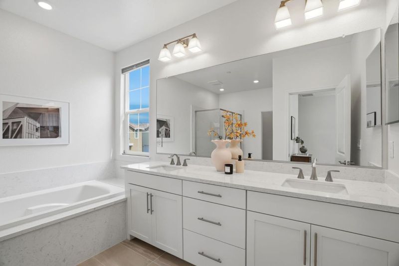 - Double Sinks, Half on Ground Floor, Primary - Stall Shower(s), Primary - Sunken Tub, Showers over Tubs - 2+, Tile