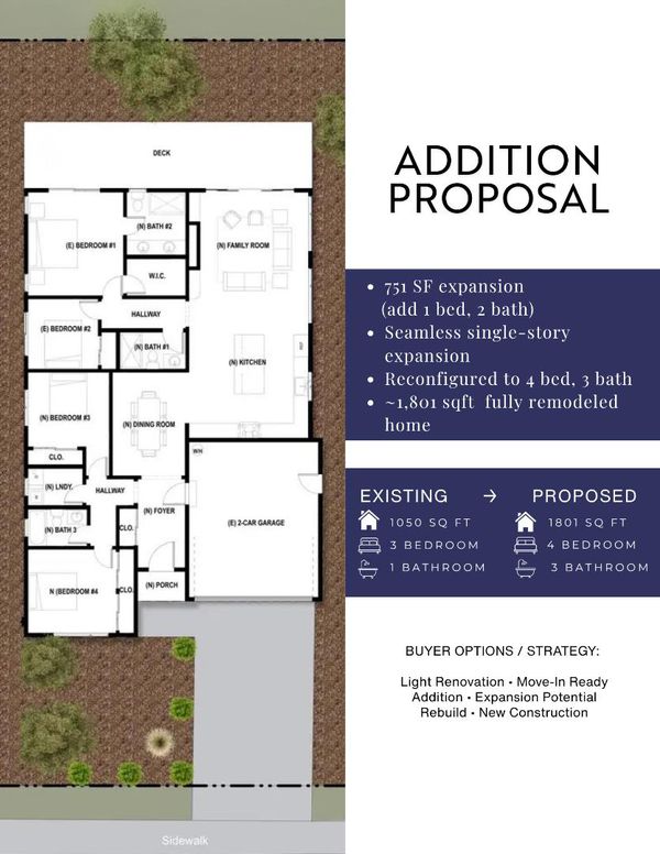 Rare opportunity to secure prime lot with exceptional expansion or new construction potential. Located in the highly desirable Charleston Meadow neighborhood of Palo Alto with access to top-rated Henry M. Gunn High School. The home has been refreshed with interior & exterior paint throughout, low maintnance landscaped yards, easily move-in ready with light cosmetic remodeling, design it with the style best match your taste. Seller has already partnered with architect to provide thoughtfully designed addition and new construction proposals, offering three tailored pathways to match your vision and timeline: 1. Move-in with a quick cosmetic remodel that suits your style. 2. Expand ~751sqft Addition: Enhance the existing home with a proposed ~751 sqft addition, creating a single-story 4 bed, 3 bath residence totaling ~1,801 sqft living space. 3. Rebuild new construction: Build a brand-new 2-story luxury home (~2,608 sqft total living), featuring a 4 bed, 3 bath main residence plus an attached 1 bed, 1 bath ADU (~578 sqft). A unique opportunity combining move-in readiness, top-tier schools, and clearly defined development pathwaysallowing you to live, expand, or build new in one of Palo Altos most sought-after neighborhoods.