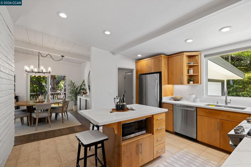 - Dishwasher, Microwave, Free-Standing Range, Refrigerator, Dryer, Washer, Stone Counters, Eat-in Kitchen, Kitchen Island, Range/Oven Free Standing, Updated Kitchen