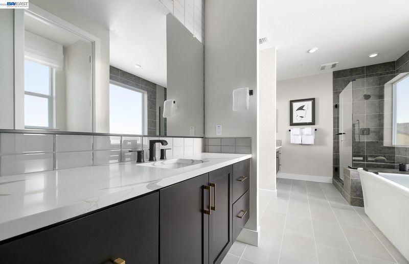 This spacious Plan 3 features an open floor plan with covered patio, spacious loft, quartz kitchen countertops, white cabinetry, stainless steel KitchenAid appliances, full height backsplash and more. This beautiful home is available now. Photos are of model home, not of actual home.