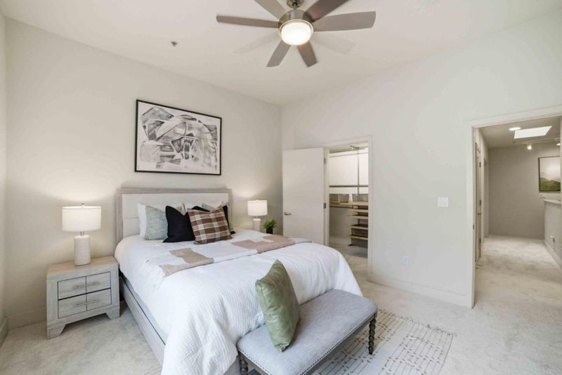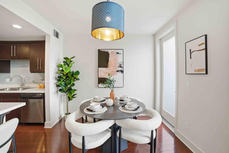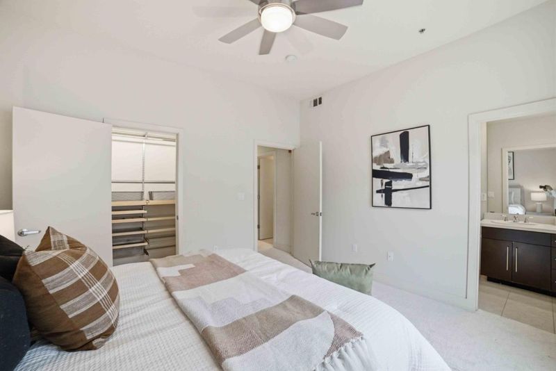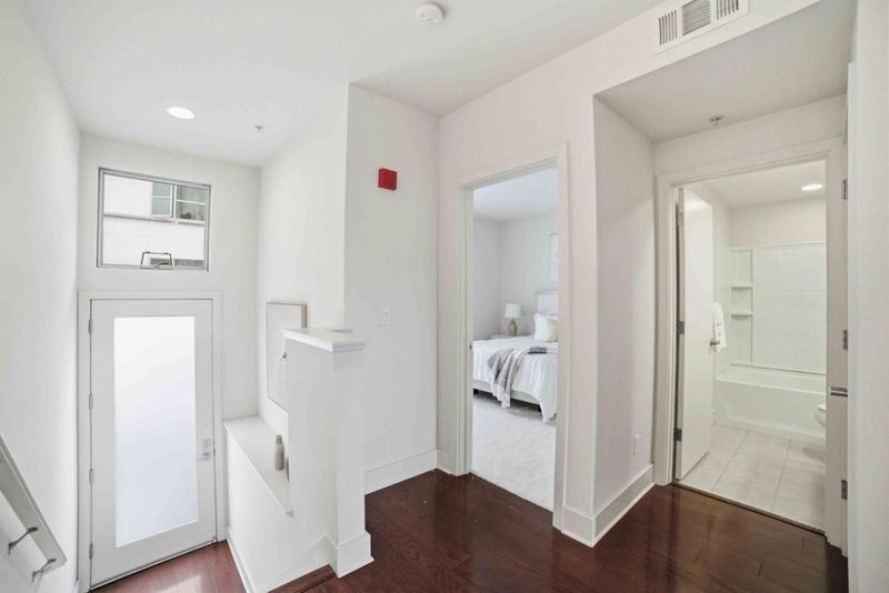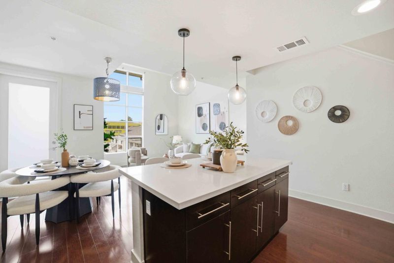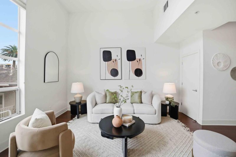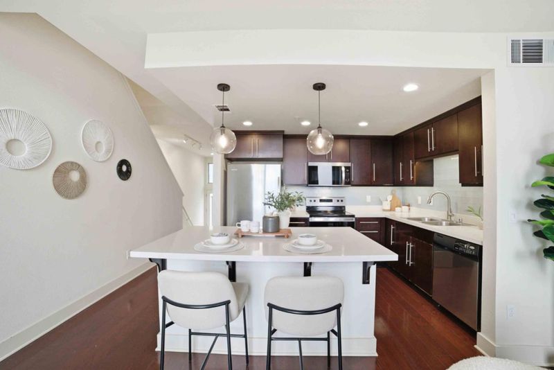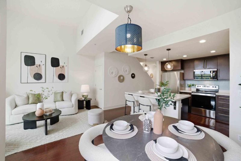 Welcome to this beautifully appointed townhouse-style condo in the exclusive One East community, a boutique community in the heart of Downtown San Jose. This 3-bedroom, 3-bath home offers 1,348 sq ft of stylish, modern living with a highly desirable and functional layout. The open-concept main level showcases rich hardwood flooring, soaring vaulted ceilings, and expansive windows that fill the space with natural sunlight. The soaring vaulted ceilings enhance the sense of openness and make the room feel airy and bright. The contemporary kitchen is designed for both everyday living and entertaining, featuring a large kitchen island with bar seating, quartz countertops, and stainless steel appliances. The flexible floor plan includes one bedroom and full bath on the main level, ideal for guests, with two additional bedrooms upstairs. New plush carpeting upstairs and in the bedrooms. The spacious primary suite includes a private en suite bathroom, creating a serene retreat. Home include two dedicated parking spaces in a secured gated garage. Ideally located just moments from San Pedro Square, SAP Center, Japantown, and an array of dining, shopping, and entertainment options. Convenient access to Highways 87, 101, 880, 280, and public transportation nearby.